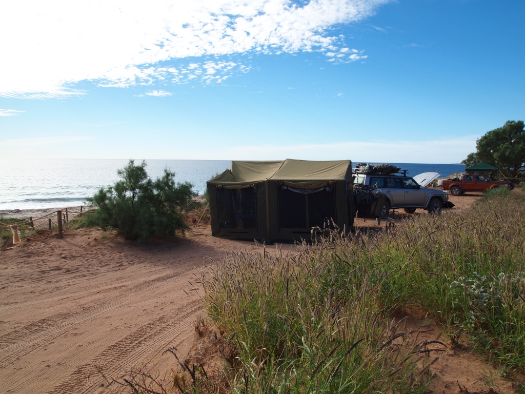 We had a slightly sleepless night worrying ‘what if the cyclone came in earlier than predicted? how we would fare with only a canvas tent over our heads.’ The lovely ocean nearby was totally pounding into shore evident of the wind and turbulence at sea. Fortunately when we woke it was overcast and a bit windy but no cyclone. We decided to head back to Carnarvon and take cover anyway.